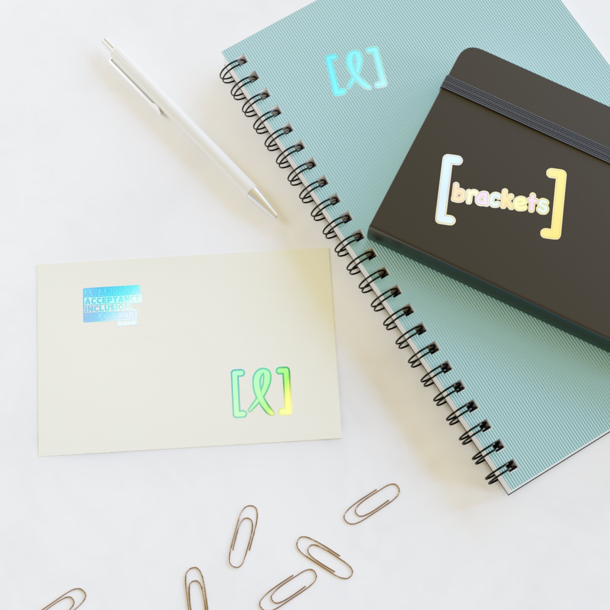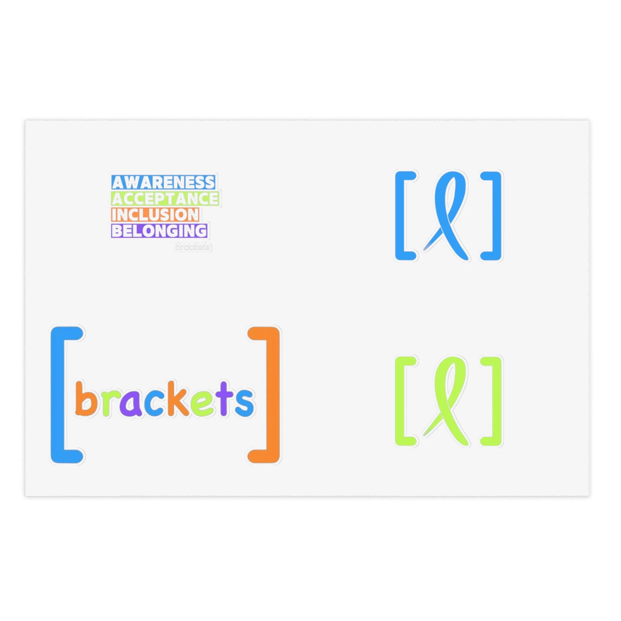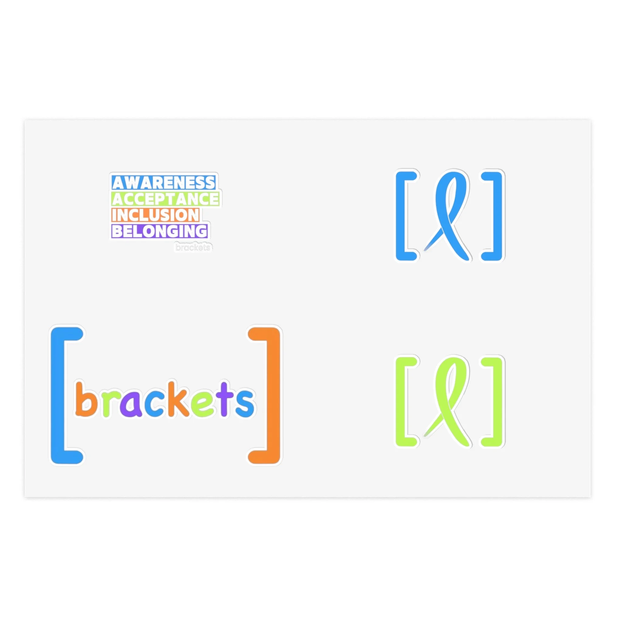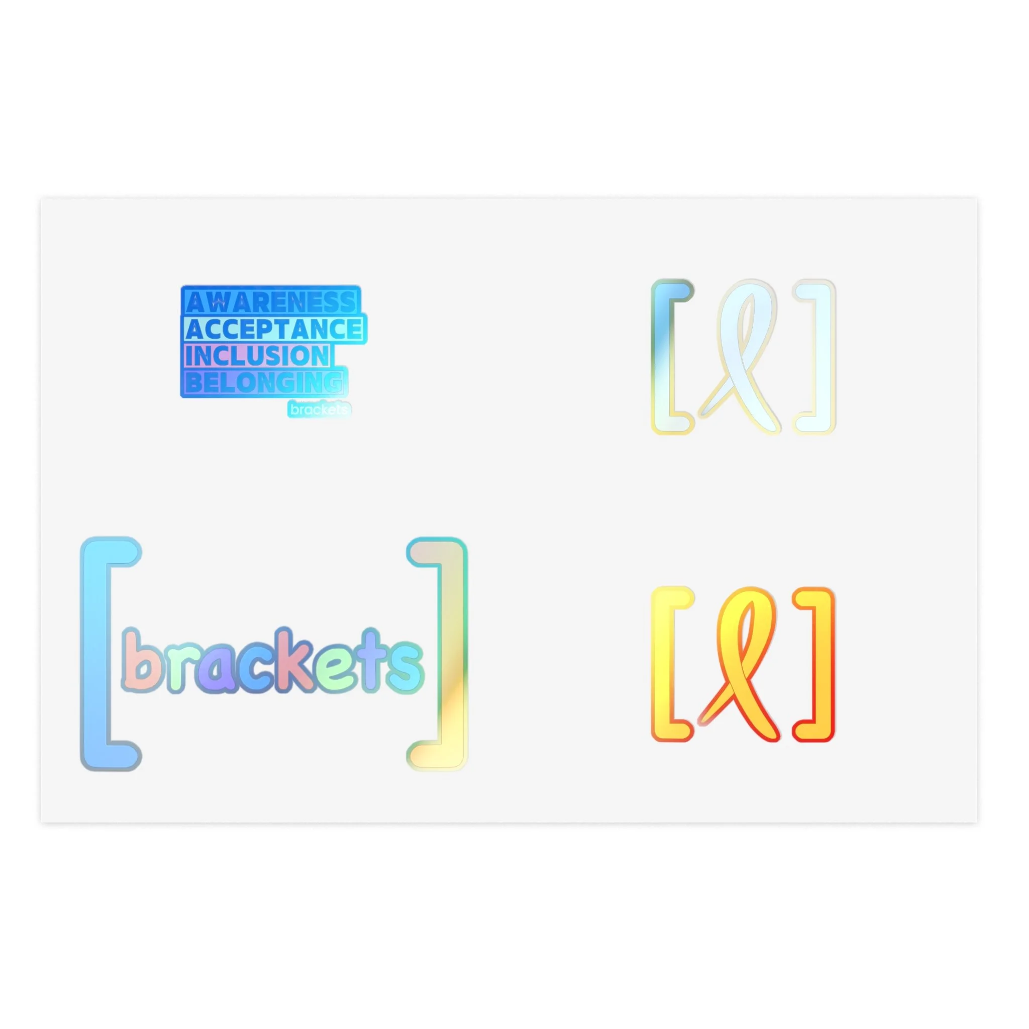 Bright, playful sticker sheets made to celebrate inclusion, accessibility, and community. Each sheet combines colorful bracket motifs and a colorful [brackets] logo that pop against white, holographic, or transparent vinyl. The stickers carry a soft matte laminate for UV protection and a water-resistant finish, so they stay vivid on laptops, journals, planners, and short-term outdoor surfaces. Lightweight and easy to apply, these sheets bring a small, thoughtful statement to everyday items — a quiet reminder of belonging every time you reach for your notebook or phone case.